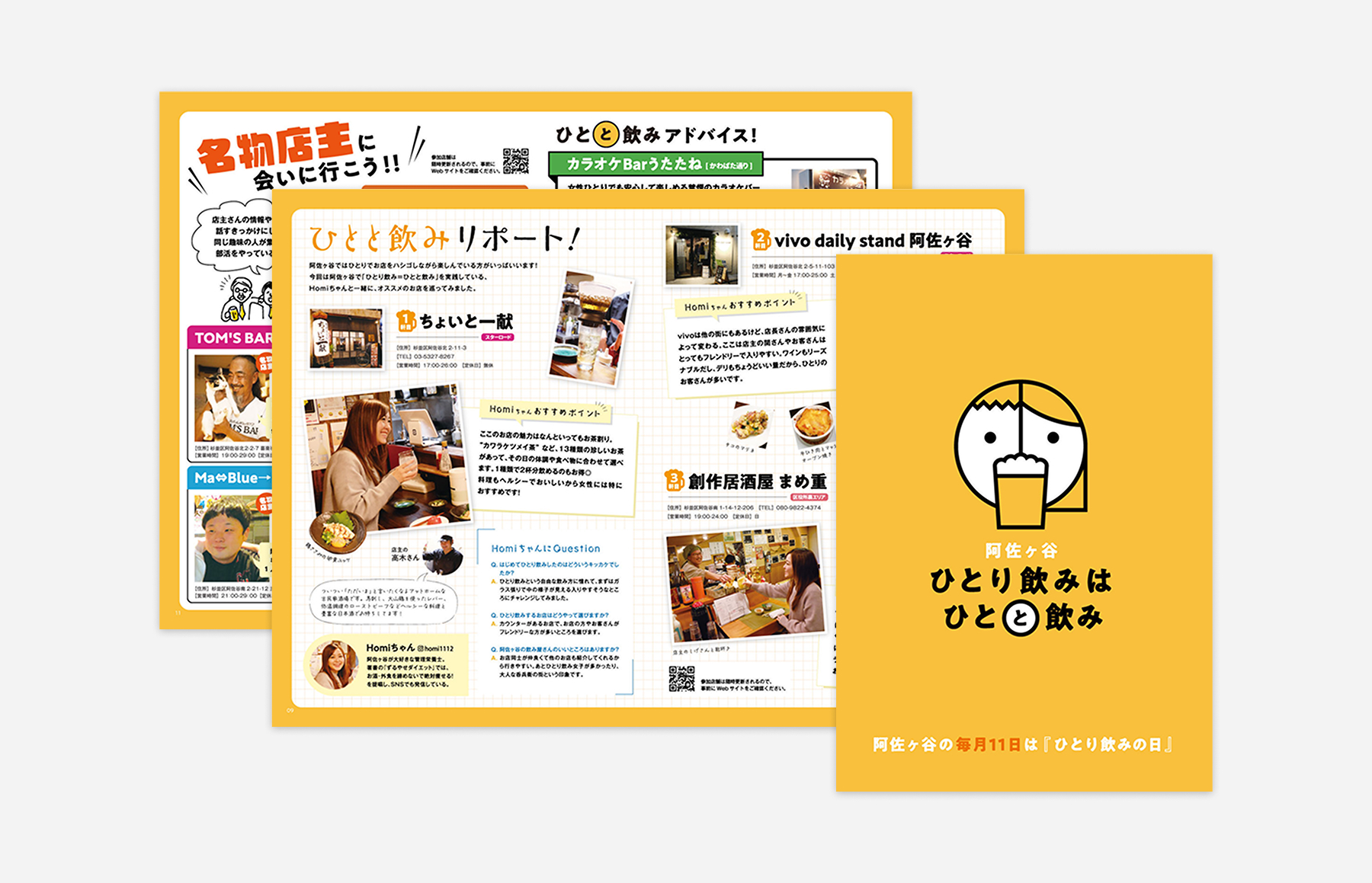 『阿佐ヶ谷はひとり飲みの街』の文化を推進する杉並区公認のプロジェクト。2024年1月に企画がリニューアルされ、ガイドブック制作の一部ページのクリエイティブディレクションに携わりました。構成、取材、撮影、デザインディレクションを担当しました。